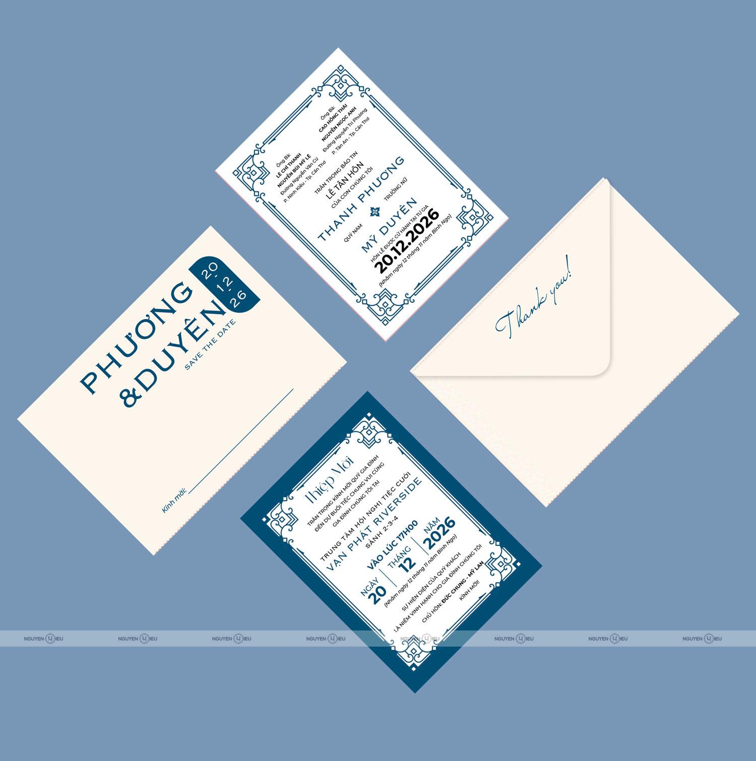 Đây là mẫu thiệp được thực hiện bởi Nguyen Hieu Invitation, nên hình ảnh logo thương hiệu Nguyễn Hiếu sẽ được in ở mặt sau bao thư đảm bảo yêu cầu về xuất xứ sản phẩm.